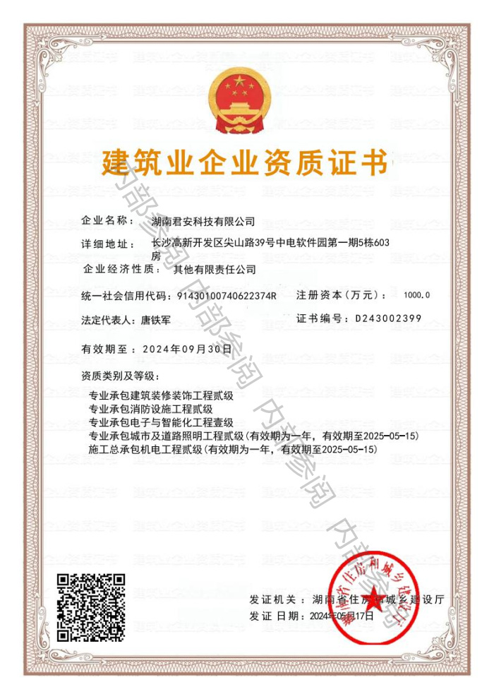電子與智能化工程專業承包壹級;消防設施工程專業承包貳級;建筑裝修裝飾工程專業承包貳級;施工總承包機電工程貳級;城市及道路照明貳級